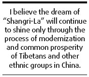 It would be impossible for the Tibetan culture to carry on if the Tibetans returned to the so-called "holy Buddhist land" where "all people become monks", or if Tibet returned to the age of dark theocratic rule and the brutality of the feudal serf system. Today's Tibet has transformed itself, coming out from under a dark and cruel theocratic feudal serf system, and becoming a self-sufficient, progressive, just, equal and open society. In the old Tibet, life expectancy was 35.5 years, but now it has reached 67 years. This is the real "Shangri-La." During the 40 years from 1965 to 2005, the Chinese central government supported the local Tibetan government with about 97 billion yuan. Since 1993, the central government has offered transfer payments for Tibet which covers over 90 percent of the local governments' revenues. This has greatly supported the social and economic growth in Tibet. The annual growth rate of the economy in Tibet has exceeded 12 percent in seven consecutive years, which is much higher than the average growth rate of the whole nation. The rapid growth of the economy in Tibet benefits the protection of Tibetan Buddhism even more. There are now over 1,700 Tibetan Buddhist temples and nearly 50,000 monks. Sutra Banners and Mani Stone Mounds (Tibetan Buddhist Altars) are everywhere. Over a million Tibetans go on pilgrimages to the temples in Lhasa. The Tibetan scholars in China claim that the concepts of modernization have penetrated into the hearts of most of the Tibetan Buddhists, and many of them support developing some aspects of Tibetan Buddhism to make them relevant to modern society. Today's Tibet values and protects its own unique culture more than ever. This is the unchanging "Shangri-La". Today's Tibet tries its best to get rid of blindness and backwardness and runs towards its own happy and bright future. This is the changing "Shangri-La". The so-called "Tibet Issue" is always the meeting point of two issues. The first issue is that of sovereignty, which is to safeguard the unity of the nation and to oppose separatism, and the second issue is that of social reform, which leads to progress and a bright future and to oppose restoration of the old feudal system. Regarding the issue of sovereignty, the answer is clear. Any request or proposal regarding separation from China, even in disguised forms, should be abandoned and opposed. There is no way for Tibet to be independent, semi-independent or have any disguised form of independence. No country in the world supports the "independence of Tibet". For instance, during this year, the Dalai Lama made a speech at the British Parliament, deliberately talking about "the great and profound historical relationship between Tibet and England", and saying that "the United Kingdom has to carry out the mission of making history in terms of the Tibet issue". However, the British government soon after declared that it does not support the independence of Tibet. The Dalai Lama and his followers had to reluctantly announce to the public that they "do not ask for independence." Regarding the second issue of social reform, the answer seems complicated and confusing. On the surface, the Dalai Lama has claimed a "middle way" which is "not to look for independence but for autonomy"; in reality, he has pushed religion to its extreme, equated religion with ethnicity, and combined religion and politics. Doing so is no more than a way to indirectly seek the "independence of Tibet" at the cost of sacrificing the basic rights of the Tibetans and impeding the development of Tibet, and to cause Tibet to return to the theocratic serf system. Such a scheme wears a sacred halo, makes a pretext of "seeking the benefits of the Tibetans", makes up a legend about "Shangri-La", and is also disguised with many lovely concepts, such as democracy, human rights and religious liberty. Nevertheless, it is not difficult for the Westerners who understand the history of the darkness and despotism of theocracy in Western Europe during the medieval period to understand that this is far from what has been imaged as the "Shangri-La". Recently, their scheme was disguised under a legal packaging, by distorting the autonomous laws of the ethnic regions of China and releasing the "Memo for the Authentic Autonomy for All Tibetans" to drum for the so-called "real autonomy" of the "Tibetan Tibet". The ethnic majority scatters and the minorities gather, which is the basic situation for the 56 nationalities in China. All of the ethnic groups in China belong to a diverse and well-connected community, and form a "golden principle" of "three non-separations". The Han cannot be separated from the ethnic minorities and vice versa as well as the ethnic groups cannot be separated from one another. This principle has led to a reality that ethnic autonomy is closely related with regional autonomy. What are the true intentions of "real ethnic autonomy" with unrestrained "autonomy of a single ethnic group" so as to segregate other ethnicities from that area? What are the real motives of trying to combine into "a pure and larger Tibetan area" an "ethic group, religion and culture" at the cost of violating the "three non-separation" principle? What they really want is not Tibet's "autonomy", but the "suicide" of the Tibetans caused by ethnic segregation, ethnic antagonism, and separation. Has not the "Tibetan Youth Congress" clamored for "fighting for independence" through "suicides"? There is no way to separate Tibet from China, and no way for Tibet to return to the feudal serf system. Neither the tide of history, the Tibetan people nor the "holy land" of "Shangri-La"will allow it to happen. Only if Tibetans have a happy and prosperous life like other ethnic groups, can Tibet become what was described by the American author James Hilton in his novel, Lost Horizon, as "an everlasting peaceful land". I believe the dream of "Shangri-La" will continue to shine only through the process of mode