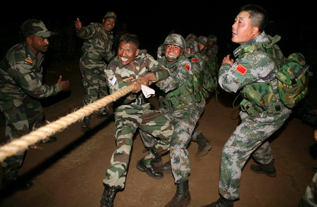 A tug-of-war is held after the China-India joint anti-terror training exercise in India's Belgaum, December 7, 2008. A week-long China-India army joint anti-terrorism training aiming at promoting the two armies' mutual understanding and trust is now in its second phase. [Xinhua]