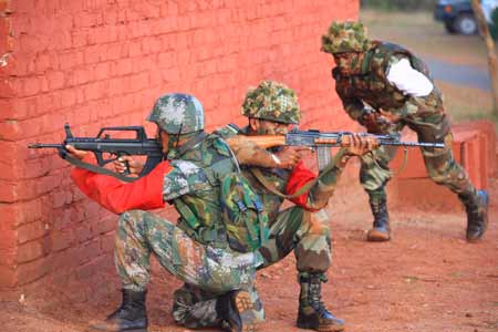 Chinese and Indian soldiers attend the comprehensive drills of the "Hand in Hand 2008" China-India army joint anti-terrorism training in Belgaum of India, December 10, 2008. [Xinhua]