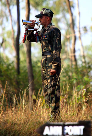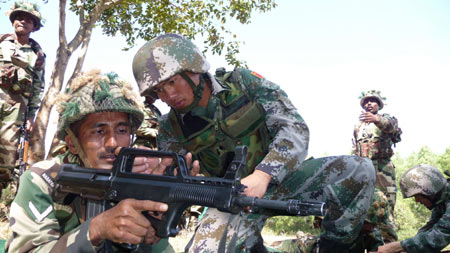 An Indian soldier tries a Chinese weapon during a training session of the "Hand in Hand 2008" China-India army joint anti-terrorism training in Belgaum of India, December 9, 2008. The training sessions of the joint anti-terrorism training went smoothly. During the sessions, the soldiers will train in anti-terror shooting and raids, exchange views on anti-terror theories and civilian and judicial issues, and carry out comprehensive drills with the theme of closing, controlling and searching. [Xinhua]