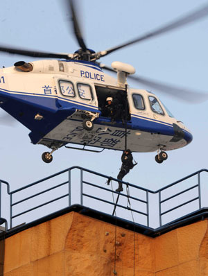 ![]() An officer of the Beijing Special Armed Police Unit rappels from a helicopter during an anti-terrorist drill in Beijing, December 13, 2008. [Xinhua]