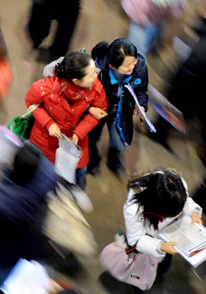 Job seekers crowd a job fair in Beijing, capital of China, December 14, 2008. More than 20,000 postgraduates visited on Sunday the special job fair which offered over 142,000 positions by more than 700 enterprises. [Xinhua]