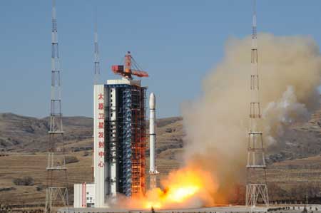The Long March-4B rocket carrying the remote-sensing satellite "Yaogan V" blasts off from the Taiyuan Satellite Launch Center in north China's Shanxi Province, December 15, 2008. The satellite will be used for data collection and transmission involving land resources surveys, environmental surveillance and protection, urban planning, crop yield estimates, disaster prevention and reduction, and space science experiments. [Xinhua]