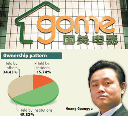 ![]() While its main rival Suning adopted a steady expansion path, the aggressive Gome opened outlets even in far-flung locations and in many cases at high rentals, they said. The company's shares have also been falling continuously over the last few months. Gome shares closed on Nov 21 at HK$1.12, with a market capitalization of HK$14.3 billion. Just a year back the share prices were as high as HK$21. Its trading has been suspended since Nov 24. "I'm concerned at how much share Gome and Huang would sell and whether the company would lose its influence on the retail market," said Tian. Huang holds around 36 percent stake in Gome, with second largest shareholder JP Morgan owning 8.88 and the third largest Morgan Stanley 8.17 percent. Founded in 1987 from a small shop, Gome has grown to become the largest electrical retailer in China with over 1,300 stores. Its closest rival Suning in comparison had just 784 stores at the end of September. Gome has a 40 percent share of the electrical retail market in the country, while Suning holds a mere 7 percent. Analysts said that the shareholding pattern in Gome may act as a deterrant for any stake sale as it would need approval from the majority shareholder Huang. It is also unclear on how the probe findings would impact the company in the near future. To cope with the crisis, Gome has appointed its CEO Chen Xiao as acting chairman. But the company is still vulnerable to fresh bouts of turbulence, analysts said. According to Wu, the priority for Gome is to improve cash turnover and win back consumers', suppliers and market confidence.