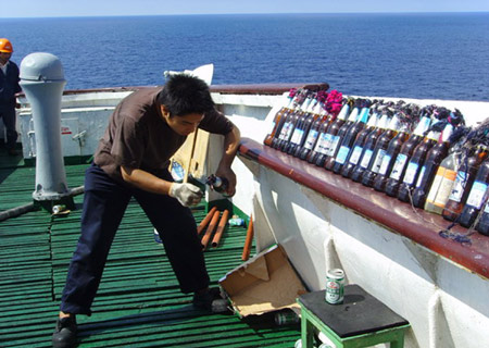A sailor get ready to defend from pirates' attacks on the deck of the Chinese ship "Zhenhua 4" in the Gulf of Aden, on December 17, 2008. The Chinese ship escaped the pirate hijack in the Gulf of Aden on Wednesday, after the crew fought for four hours with the help of a multi-coalition force. No injuries or deaths were reported. Nine pirates armed with rocket launchers and heavy machine guns boarded the ship. The 30 crew members locked themselves in their accommodation area, using fire hydrants and firebombs to prevent the attackers from entering, said an official with China Maritime Search and Rescue Center. [Xinhua]