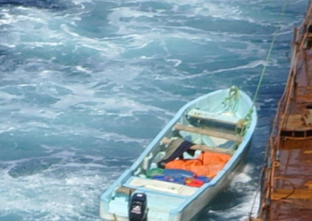 Photo taken on December 17, 2008 shows a pirate boat near the Chinese ship "Zhenhua 4" in the Gulf of Aden. [Xinhua]