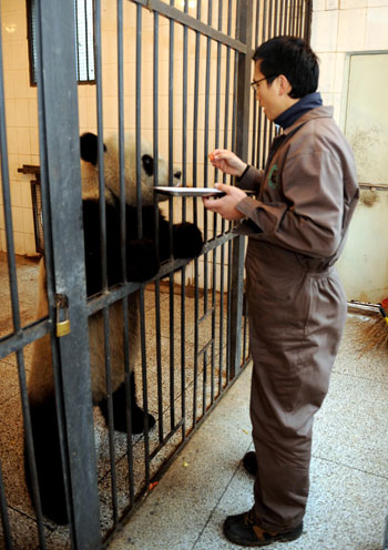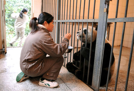A Taiwan caretaker trains Tuan Tuan, one of the two pandas donated and to be sent by the Chinese mainland toTaiwan, at a panda breeding base in Ya'an county, southwestChina'sSichuanprovince, December 21, 2008. [Xinhua]