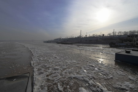 Ice and slush moves past a float bridege at the Jinan section of the Yellow River in Jinan, east China's Shandong province December 23, 2008. [Xinhua]