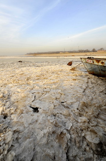 Ice and slush moves past a float bridege at the Jinan section of the Yellow River in Jinan, east China's Shandong province December 23, 2008. [Xinhua]