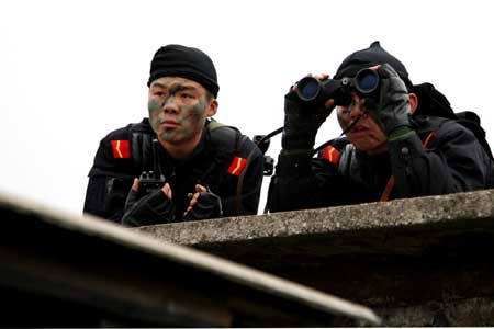 ![]() Members of a local special armed police unit reconnoiter during an anti-hostage-taking drill in Guiyang, capital of southwest China's Guizhou Province, Dec. 25, 2008. [Xinhua]