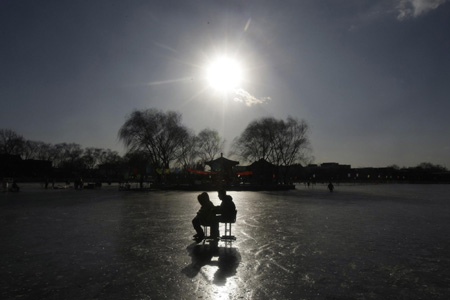 People rides on a specially constructed "ice-chair" on a frozen lake in Beijin December 29, 2008. [Agencies]