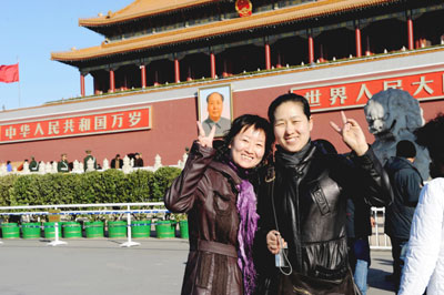 Two visitors pose for a photograph in the Tian'anmen Square in the center of Beijing March 3, 2008. The first session of the 11th National Committee of the Chinese People's Political Consultative Conference is to open in the Great Hall of the People, next the square, Monday afternoon. [Xinhua]