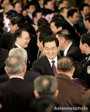 President Hu Jintao (C) greets other deputies to the First Session of the 11th National People's Congress at the preparatory meeting in the Great Hall of the People in Beijing March 4, 2008. [Asianewsphoto]