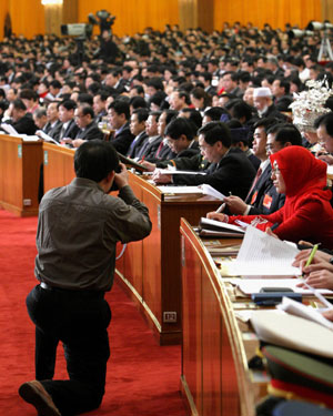 A photo journalist kneels on the floor to take pictures of deputies to the first session of the 11th National People's Congress in the Great Hall of the People in Beijing March 5, 2008. [Xinhua]