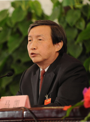 Ma Kai, minister of China's National Development and Reform Commission, answers a question during a press conference on economic and social development and macro economy held by the First Session of the 11th National People's Congress (NPC) at the Great Hall of the People in Beijing March 6, 2008. [Xinhua]