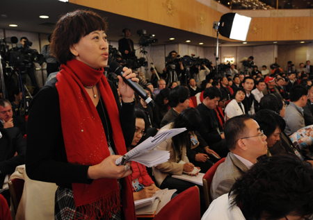 A journalist asks a question during a press conference on economic and social development and macroeconomic regulation held by the First Session of the 11th National People's Congress (NPC) at the Great Hall of the People in Beijing March 6, 2008. [Xinhua]