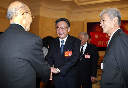 (Xinhua) Updated: 2008-03-07 22:33 ![]() Wu Bangguo (C), member of the Standing Committee of the Political Bureau of the CPC Central Committee and chairman of the 10th NPC Standing Committee, shakes hands with deputies from the Macao Special Administrative Region before joining their panel discussion March 7, 2008. [Xinhua]