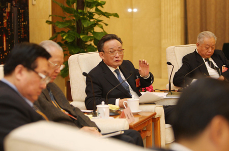 Wu Bangguo (C), member of the Standing Committee of the Political Bureau of the CPC Central Committee and chairman of the 10th NPC Standing Committee, speaks as he joins deputies from the Hong Kong Special Administrative Region during a panel discussion March 7, 2008. [Xinhua]