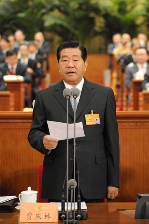 Jia Qinglin, chairman of the National Committee of the Chinese People's Political Consultative Conference (CPPCC), presides over the closing meeting of the First Session of the 11th CPPCC National Committee at the Great Hall of the People in Beijing, capital of China, March 14, 2008. [Xinhua]