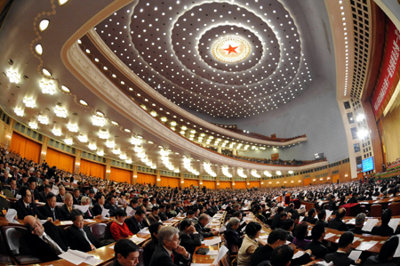 Members of the Chinese People's Political Consultative Conference (CPPCC) attend the closing ceremony of the first session of the 11th National Committee of the CPPCC at the Great Hall of the People in Beijing on Friday, March 14, 2008. [Xinhua]