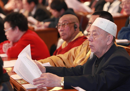 Members of the Chinese People's Political Consultative Conference (CPPCC) attend the closing ceremony of the first session of the 11th National Committee of the CPPCC at the Great Hall of the People in Beijing on Friday, March 14, 2008. [Xinhua]