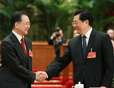 President Hu Jintao (R) shakes hands with Wen Jiabao to congratulate him to be the premier of the State Council in the Great Hall of the People in Beijing March 16, 2008. The nomination of Wen as the premier by Hu was approved at the First Session of the 11th National People's Congress. [Xinhua]