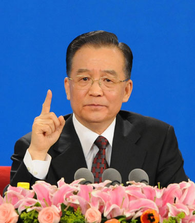Premier Wen Jiabao gestures while answering a question on a press conference after the closing ceremony of the First Session of the 11th National People's Congress (NPC) at the Great Hall of the People in Beijing, capital of China, March 18, 2008. The annual NPC session closed on Tuesday. [Xinhua]