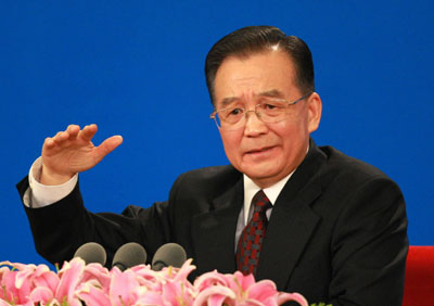 Premier Wen Jiabao gestures while answering a question on a press conference after the closing ceremony of the First Session of the 11th National People's Congress (NPC) at the Great Hall of the People in Beijing, capital of China, March 18, 2008. The annual NPC session closed on Tuesday. [Xinhua]
