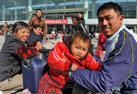 Migrant workers from Chongqing wait for trains home at Fuzhou Railway Station on January 1, 2009. The station is seeing an increasing flow of passengers with the impending of the Spring Festival travel season, which will last from January 11 to February 19 this year. [Xinhua]