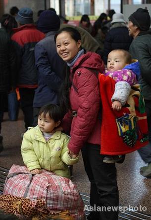A mother and her two children wait for trains at Beijing West Railway Station on Thursday, January 1, 2009. Millions of people started setting home on long journeys on Friday from Beijing as the city kicked off its Spring Festival travel season early. [Asianewsphoto]