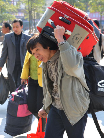 A man carrying his belongings walks towards Fuzhou Railway Station before boarding a train home on January 2, 2009. The station is seeing an increasing flow of passengers with the impending of Spring Festival travel season, which will last from January 11 to February 19 this year. [Xinhua]