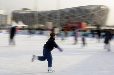 A boy skates at a temporary rink outside the National Stadium, known as the "Bird's Nest", in Beijing January 3, 2009. The 1,000-square-meter rink opened to the public from January 1, 2009 during the New Year holiday. [Agencies]