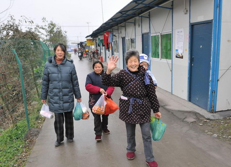People return their temporary home with groceries at a housing area for May 12 earthquake survivors in Dujiangyan, southwest China's Sichuan province January 6, 2009. [Xinhua]