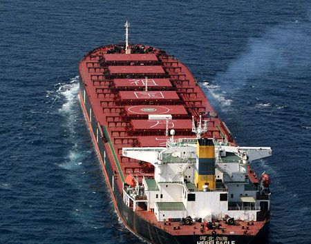 ![]() Chinese characters “Zuguo Wansui” meaning “Long Live the Motherland” are seen on the main deck of the Hong Kong-flagged merchant vessel “Hebei Eagle,” escorted by the Chinese fleet, when it sailed across the waters off Somalia, January 7, 2009. A Chinese naval fleet sails into the Gulf of Aden off Somalia earlier this week, starting a three-month mission to protect passing ships against pirates. Full Coverage [Xinhua]