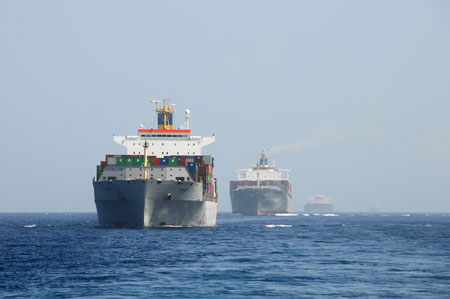 Updated: 2009-01-09 12:07 Four merchant vessels sail in a line formation under command of the DDG-169 Wuhuan destroyer in the Gulf of Aden, January 6, 2009. Full Coverage [Xinhua]
