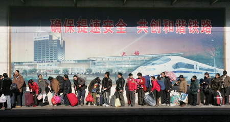 People wait in line to board a train bound for Sichuan province at a railway station in Wuxi, east China's Jiangsu province January 10, 2009. [CFP]