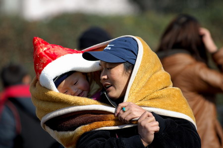 A woman carries her child on her back while waiting for a train back home at Nanjing railway station in Nanjing, east China's Jiangsu province January 10, 2009. [CFP]