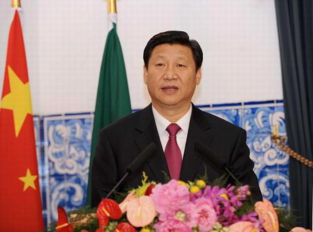 Chinese Vice President Xi Jinping delivers a speech at the welcoming banquet held by the government of Macao Special Administrative Region in Macao, south China, on Saturday, January 10, 2009. Xi Jinping arrived in Macao on Saturday for a two-day inspection tour. [Xinhua]