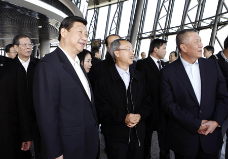 Chinese Vice President Xi Jinping (L front) inspects Macao Tower, the tallest building in Macao, south China, January 10, 2009. [Xinhua]