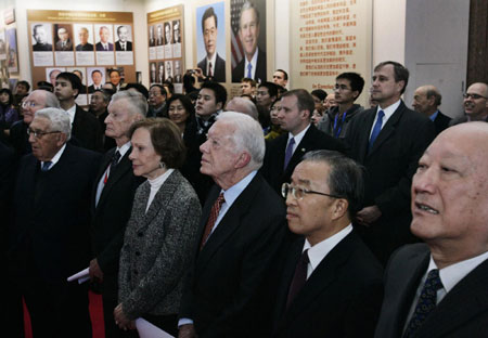 Former US President Jimmy Carter (3rd R) and former Secretary of State Henry Kissinger (L) attend a photo exhibition on 30 years of China-US diplomatic relations in Beijing January 12, 2009. Carter and Kissinger are in Beijing to celebrate the 30th anniversary of the establishment of US-China diplomatic relations which commenced on January 1, 1979. [Agencies]