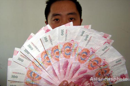 A man displays fake 100-yuan banknotes with the serial number of "HB90" at a police station in Wenzhou, East China's Zhejiang Province, January 13, 2009. Fake 100-yuan notes, most starting with the serial number "HD90," have been reported in more than ten Chinese provinces and cities. The case has aroused public attention with reports saying the quality of some fake banknotes are so high that they can even cheat low-quality counterfeit money detectors. [Asianewsphoto]