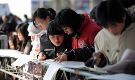 Jobseekers read leaflets of want ads at a job fair for college graduates at Hangzhou Peace International Convention and Exhibition Center in Hangzhou, east China's Zhejiang province January 13, 2009. [Xinhua]