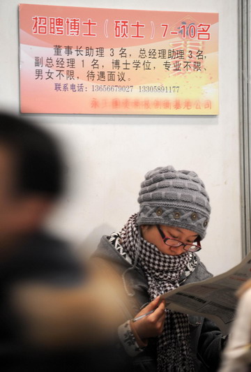 A woman reads a leaflet of want ads at a job fair for college graduates at Hangzhou Peace International Convention and Exhibition Center in Hangzhou, east China's Zhejiang province January 13, 2009. [Xinhua]