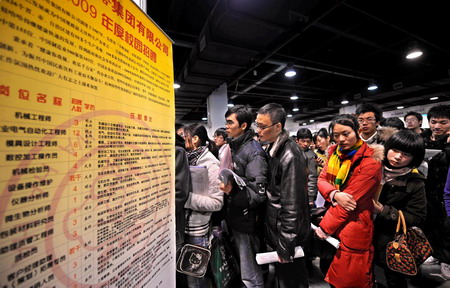 College graduates line up in front of a booth at a job fair to get an possible interview chance at Hangzhou Peace International Convention and Exhibition Center in Hangzhou, east China's Zhejiang province January 13, 2009. [Xinhua]