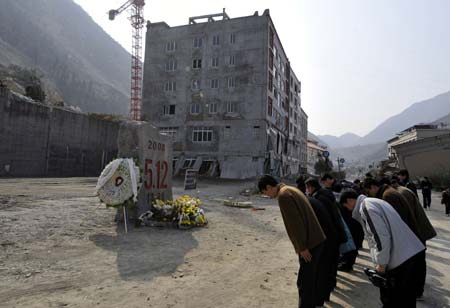 People mourn for the victims killed by the May 12 devastating earthquake last year, in Beichuan County, southwest China's Sichuan Province, Jan. 12, 2009. People in Beichuan had engaged in reconstructing their hometown with 47,814 farmers' houses completed or being built, which account for 76% of the total. [Xinhua]