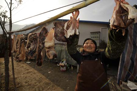 Villager Wang Subi airs the preserved ham for the upcoming Spring Festival in Leigu Town of Beichuan County, southwest China's Sichuan Province, Jan. 12, 2009. People in Beichuan had engaged in reconstructing their hometown with 47,814 farmers' houses completed or being built, which account for 76% of the total. [Xinhua]