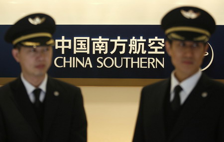 Pilots of China Southern Airlines stand in front of the company's logo before the inauguration ceremony for its branch office in Taipei January 15, 2009. China Southern Airlines on Thursday said it was the first airline company from the mainland to set up a registered office branch in Taiwan. [Agencies]