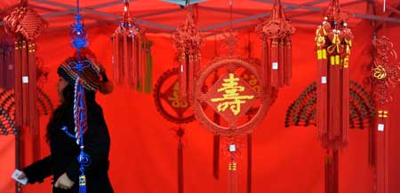 A staff member walks through works of Chinese knots during a fair of the intangible cultural heritage, in Changsha, capital of central China's Hunan Province, Jan. 17, 2009. [Xinhua]