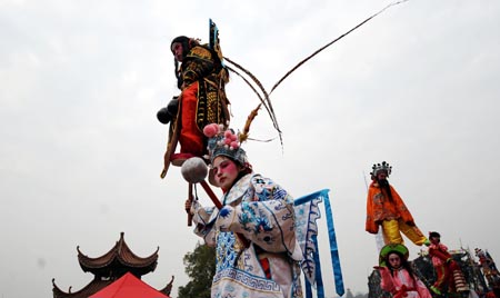 Photo taken on Jan. 17, 2008 shows a folk traditional performance on frames, with children actors under 10-year-old performing characters of fairy tales, classic drama or hero figures, during a fair of the intangible cultural heritage, in Changsha, capital of central China's Hunan Province, Jan. 17, 2009. [Xinhua]