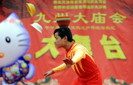 An acrobat performs during a fair of the intangible cultural heritage, in Changsha, capital of central China's Hunan Province, Jan. 17, 2009. [Xinhua]